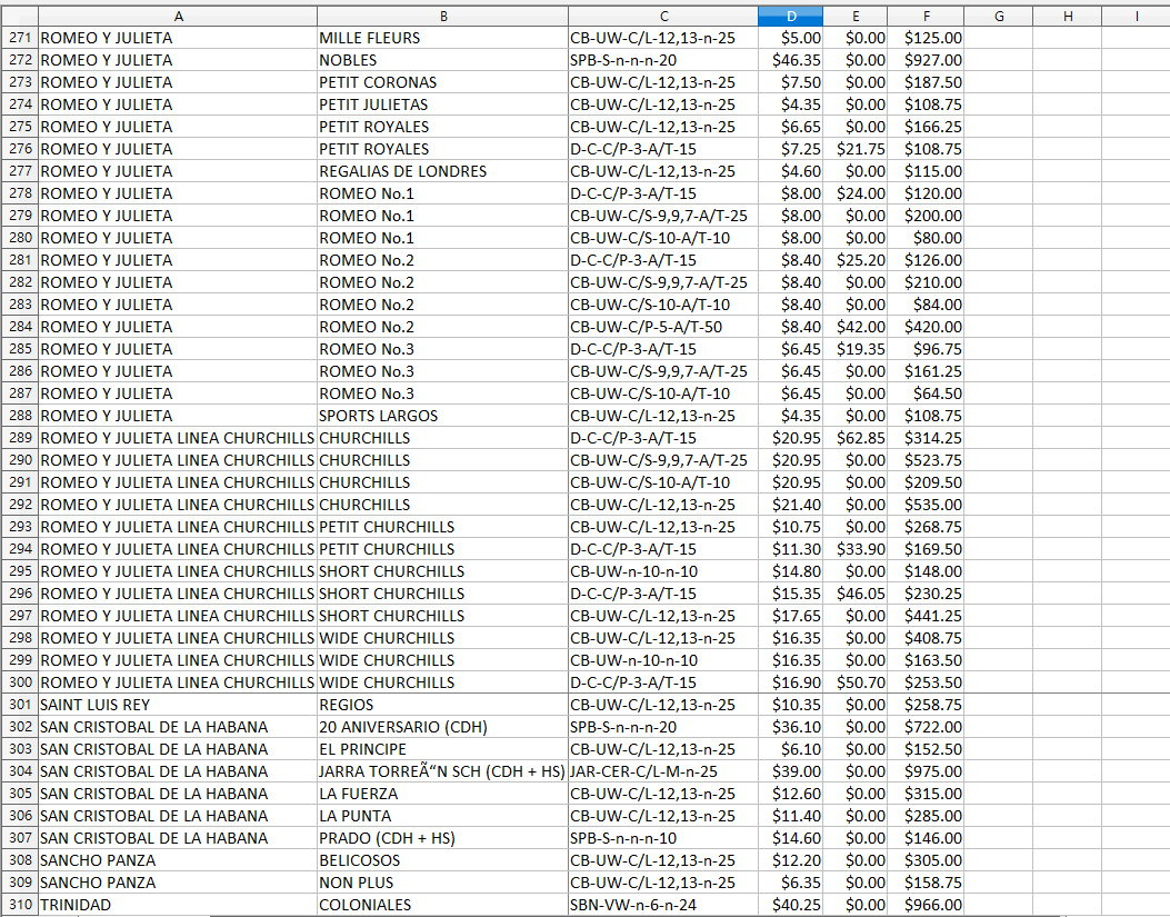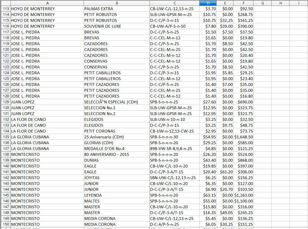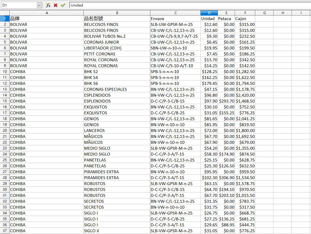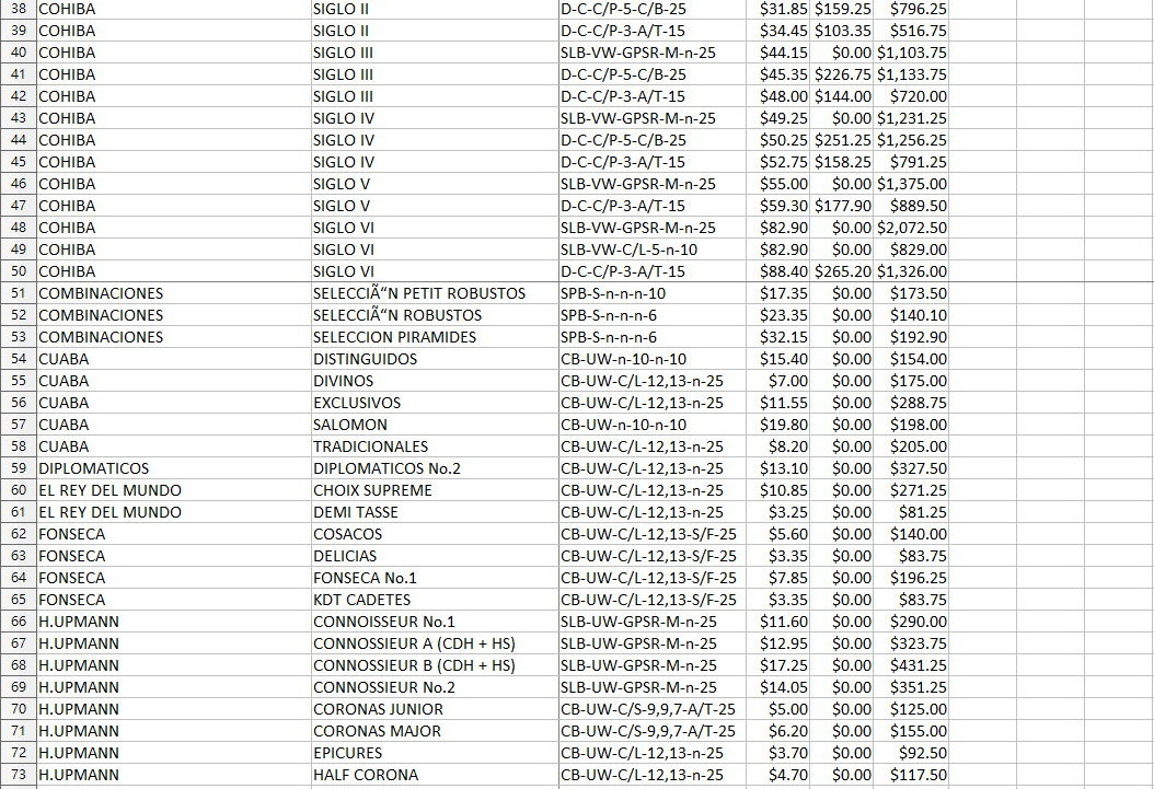 由於 Substack不支援表格,只好自己截圖拷上來,unidad(unity)指單價,如果有三根一包、五根一包的盒裝版,價錢會在petaca上看見,cajon指的是總價,編號14/15都是COHIBA ESPLENDIDOS,價格上差異在於(14)是正常一盒25根木盒包裝,而(15)則是一包3根、5包裝有15根的TUBO/紙版包裝。