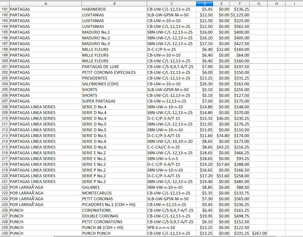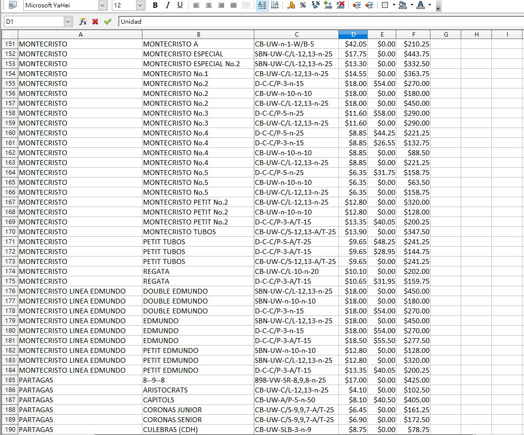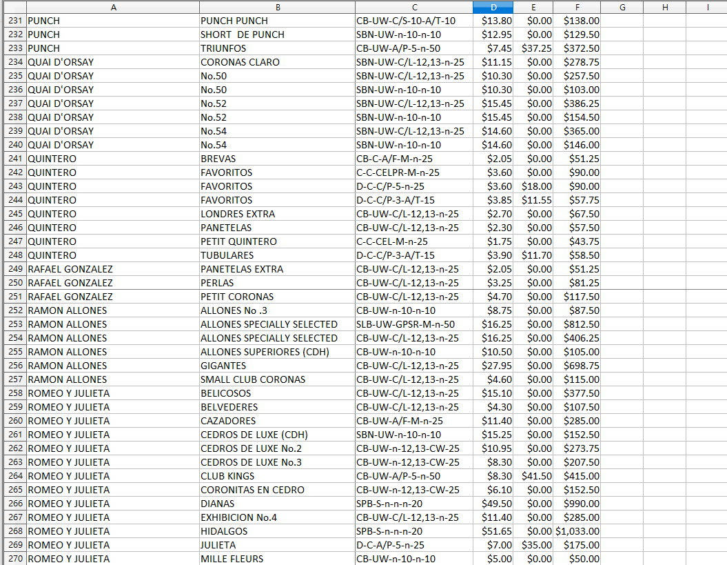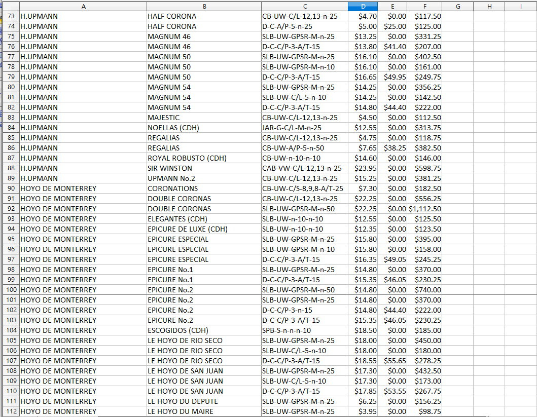 由於 Substack不支援表格,只好自己截圖拷上來,unidad(unity)指單價,如果有三根一包、五根一包的盒裝版,價錢會在petaca上看見,cajon指的是總價,編號14/15都是COHIBA ESPLENDIDOS,價格上差異在於(14)是正常一盒25根木盒包裝,而(15)則是一包3根、5包裝有15根的TUBO/紙版包裝。