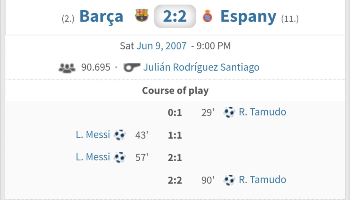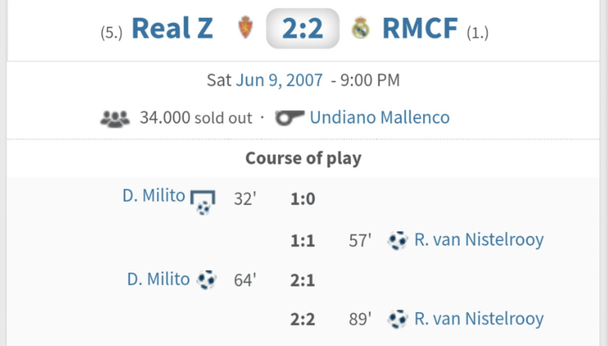 那是social media來臨之前幾年,傳統媒體根本沒把塞維利亞當一回事(沒給尊重),只報導巴薩皇馬的死鬥競爭,第37輪雙雄同時開打,皇馬卻一路落後,薩拉戈薩前鋒DIEGO MILITO很幫助弟弟(弟弟在巴薩踢後衛),進了2球讓皇馬看起來要作客輸球丟掉聯賽,因為另一邊巴薩在家面對同城死敵西班牙人,難啃但還領先,如果這樣結局延伸到比賽結束,皇馬會積分落後、即將輸掉聯賽,關鍵時刻卻發生在補時前後,皇馬范尼追平比數,同時間開踢的巴薩竟也在補時被追平!如此一來兩隊打完37輪還是同積分,但顯然巴薩會屈居亞軍。