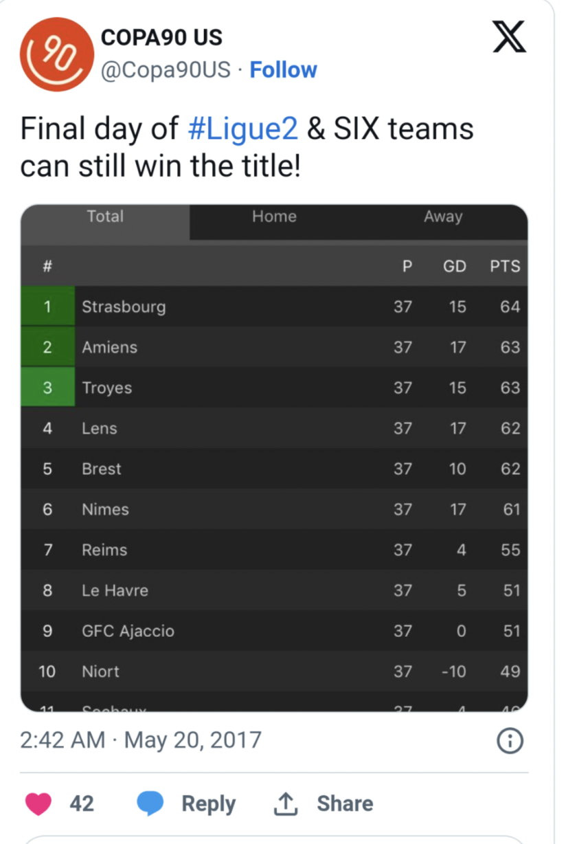 翻閱數據統計網站,2016/17的法國二級聯賽(Ligue 2)才是真正刺激,進入最後1輪之前竟然6隊有機會(可惜這事諾拉沒印象)