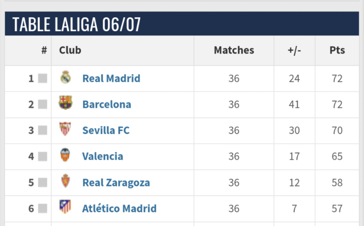 如果要選3強鼎立的經典賽季,我會選擇2006/07的西甲 ,傳奇時刻在第37輪傷停補時之際由皇馬巴薩演出的「死亡交替」 。該年最後冠亞軍積分相同(76),西班牙聯賽同積分時比較的是「對戰成績」,世界足球現在這麼流行都要感謝西甲率先實行,皇馬擁有對戰優勢,這優勢也讓他們最終得到判定奪冠,但第37輪開踢前雙雄還同積分 (⇧⇧⇧⇧圖),連第三的塞維利亞只差2分