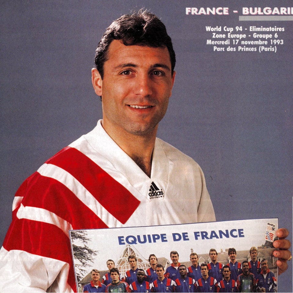 保加利亞代表隊1993年底在「巴黎王子公園球場」最後1分鐘進球淘汰法國,讓法國無緣隔年世界盃、全國上下心碎,《France Football》找到Stoichkov專訪的封面大圖居然以這方式(圖)呈現 !!!