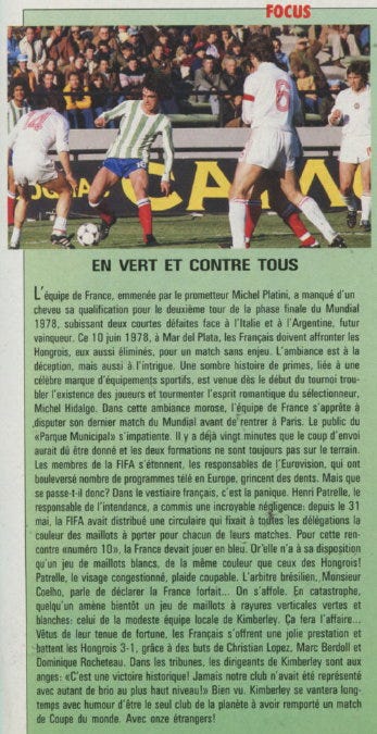 French side wearing the jerseys of a local squad from Mar del Plata, Club Atletico Kimberley, during world cup 1978, and the color is green!