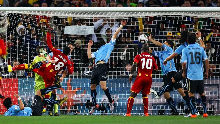 2010年世界盃八強賽,蘇亞雷斯(Luis Suarez)在延長賽補時階段因手球犯規,吃下一張紅牌,他哭著離場充滿著不甘心,烏拉圭與迦納平手眼看要進入PK ,卻幾乎被迦納人頂進絕殺,球直直奔向沒有守門員把關的大門,蘇亞雷斯球門線上張開雙手、準確地把球拍出,用一個無恥的犯規阻撓必進之球,他領到直接紅牌。