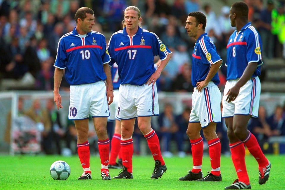 足球教練真的有在看球嗎?很多證據顯示這些體育人只看自己。馬尾金髮是Emmanuel Petit的標誌造型,身為一代法國名將,席丹身後的第一代DMF天使(馬克萊萊是第二代),1998法國冠軍時扮演關鍵主力,決賽時踢入鎖定冠軍分奠定傳奇。1997年他跟Marc Overmars同時被招攬去倫敦的兵工廠,在知名的Figo叛逃後,手上滿滿錢的巴薩趕緊買了這兩個名將,好排解媒體輿論、戰力上壓力。
