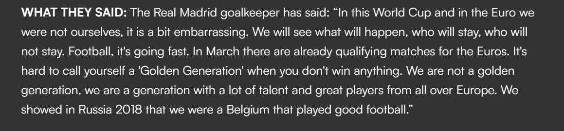 被稱做黃金世代一定要贏個什麼嗎?個人意見是 - -至少要打入決賽,1970-80年代比利時也曾在足球世界威風八面,歐錦賽亞軍、1986世界盃進入四強,整整十幾年榮光,等選手培育出了斷層、到老將退光,整整12年各項國際賽都進不去,然後才是2014年這個黃金世代登場,純論成績來說,1970-80年代比利時足球出產幾位好手、有過成績,國家隊開始被世人稱「紅魔鬼」,比較起天賦,那世代的好手也許不如現代這支比利時,但如果把時間拉長,往後過幾十年來看,會發現成績其實差不多(出色),也比不出誰天賦高低,意思就是沒贏個什麼,歷史就會遺忘你。