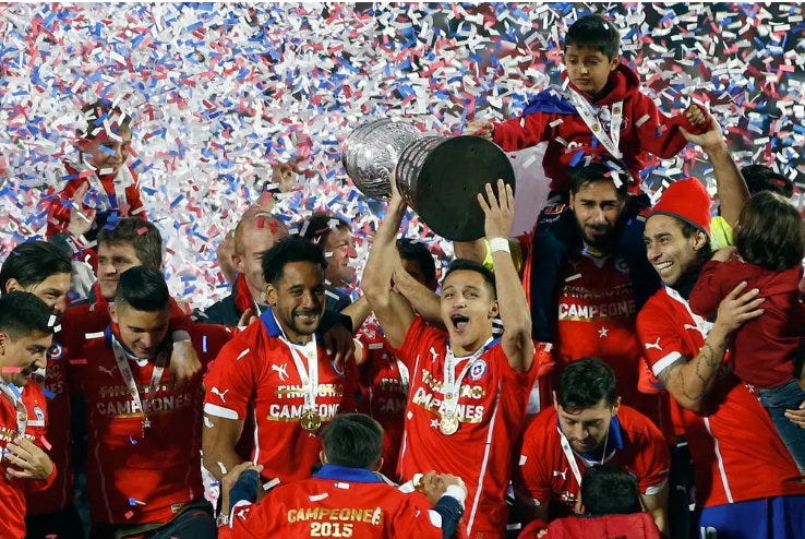 2010年智利隊跑衝十分帶勁、幾乎是人類極限的積極跑動,該世代出產不少有名氣球員,而且名字還很短好記(Vial, Isla, Medel, Vargas),突然滿滿天賦成為智利足球史上僅見,比賽很好看,但不具備贏得世界盃的能力,原以為這世代只配稱為「智利人自己的黃金一代」,隨著2015-2016連續贏下美洲盃,特別感謝Gozalo Higuain的「贊助」,這批智利好手被留在歷史,因為他們贏了獎盃,而且比梅西還要早,智利隊2個決賽都透過PK打退阿根廷。