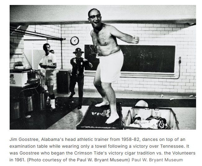 一切的開端,來自1961年阿拉巴馬校隊體能教練Jim Goostree,有感於阿拉巴馬校隊已經連輸給田納西幾年,他跟球員保證當年對決只要贏,他就要「大尺度」慶祝,結果這次阿拉巴馬大勝,他就只披著毛巾在更衣室內熱舞,發放大量的雪茄與香菸,全隊的熱烈歡呼隨著媒體披露而成名,在那之後幾年,田納西大學贏球時也開始照做,贏的一校那邊的球員、教練到死忠球迷都會抽雪茄慶祝,享受年度勝利的幸福氣息。