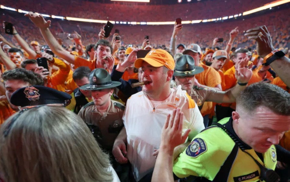 2022年那次對決,田納西大學隊不可思議的打出史詩好球,憑最後一記射門贏下暌違16年的勝利(連輸15次),田納西校隊在全美的廣大球迷群體爆出蓄積多年的能量,瘋狂慶祝橫掃社群世界,很多Z世代接受推播第一次聽聞這項傳統,原來職業奪冠抽雪茄慶祝、大學球界也這麼幹,甚至還能在場館裡開抽?!!