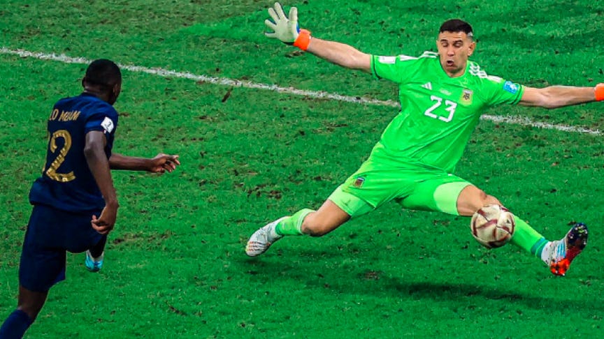 法國前鋒Kolo Muani 在延長賽要結束之際,得到「夭壽讚」的單刀/成名機會,他射門被阿根廷守門員Emi Martinez擋出,球如果進了,媒體肯定花幾十年捧他,決賽英雄就不會是演出帽子戲法的姆巴佩(Kylian Mbappé)。可惜他就沒踢進