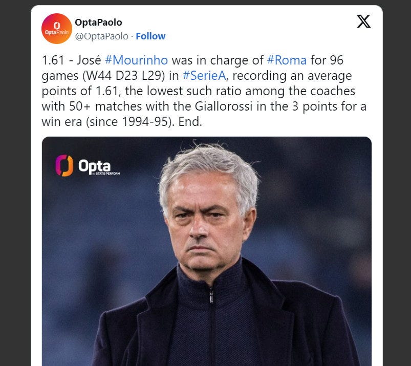 Mou帥執教過的球隊,在他執教生涯開始後(約20年最近),無論Chelsea、,熱刺、早期的羅馬卡佩羅都看到執教教練打出不同於前任、甚至不同於他過往的玩法,在什麼地方炒什麼菜、與時俱進本來就很重要,但Mourinho 沒什麼改變,表面上贏了一個歐會(沒什麼在意)、輸了一次歐霸決賽,看起來穆帥的杯賽魔力得到延續,然而聯賽的不振、完全只是中游等級的球隊發揮,防守低於他的過往數據,甚至在注重防守的義大利球界算是及格邊緣而已…